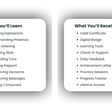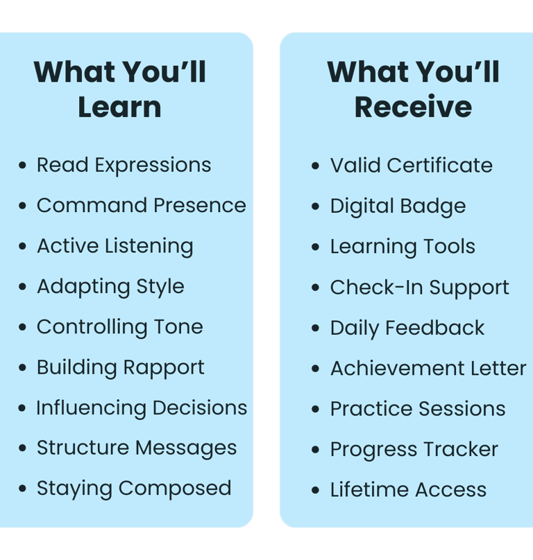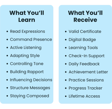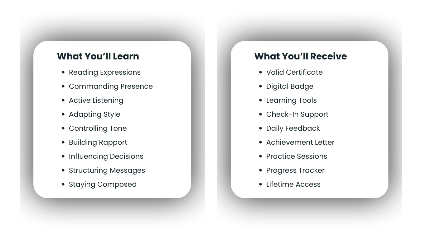 Learn to read the room, project presence, and adapt your message to any audience — while building habits, techniques, and the confidence to lead conversations long after the course ends.